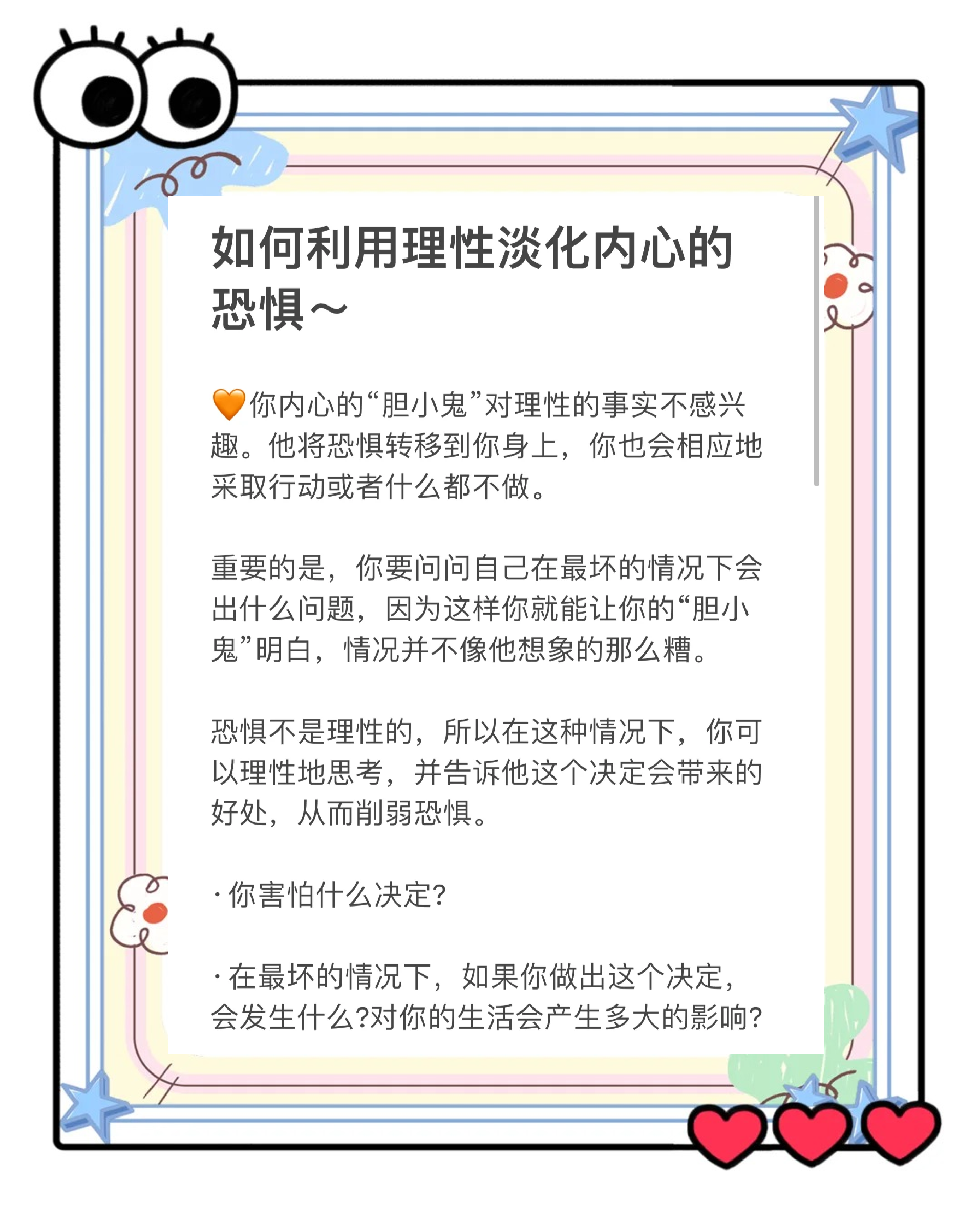 “一朝被蛇咬十年怕井绳”比喻遭过一次伤害以后就害怕遇到同样或类似的事物事件但事实上的灾祸本身往往并不是太可怕,只是心生恐惧因此,克服恐惧可以通过保持乐观的心情多学知识习惯可怕情景试着去接触害怕的东西等来方式1习惯可怕情景 对所惧怕的景物,要敢于去碰它接触它,对那些景物。